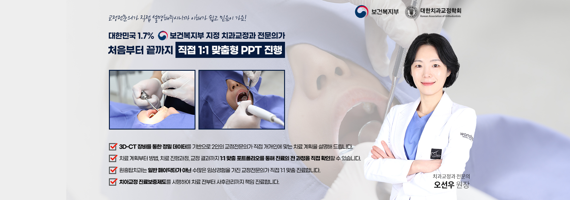 교정과, 보존과, 보철과, 구강외과, 통합치의학과 7인 의료진의 책임하에